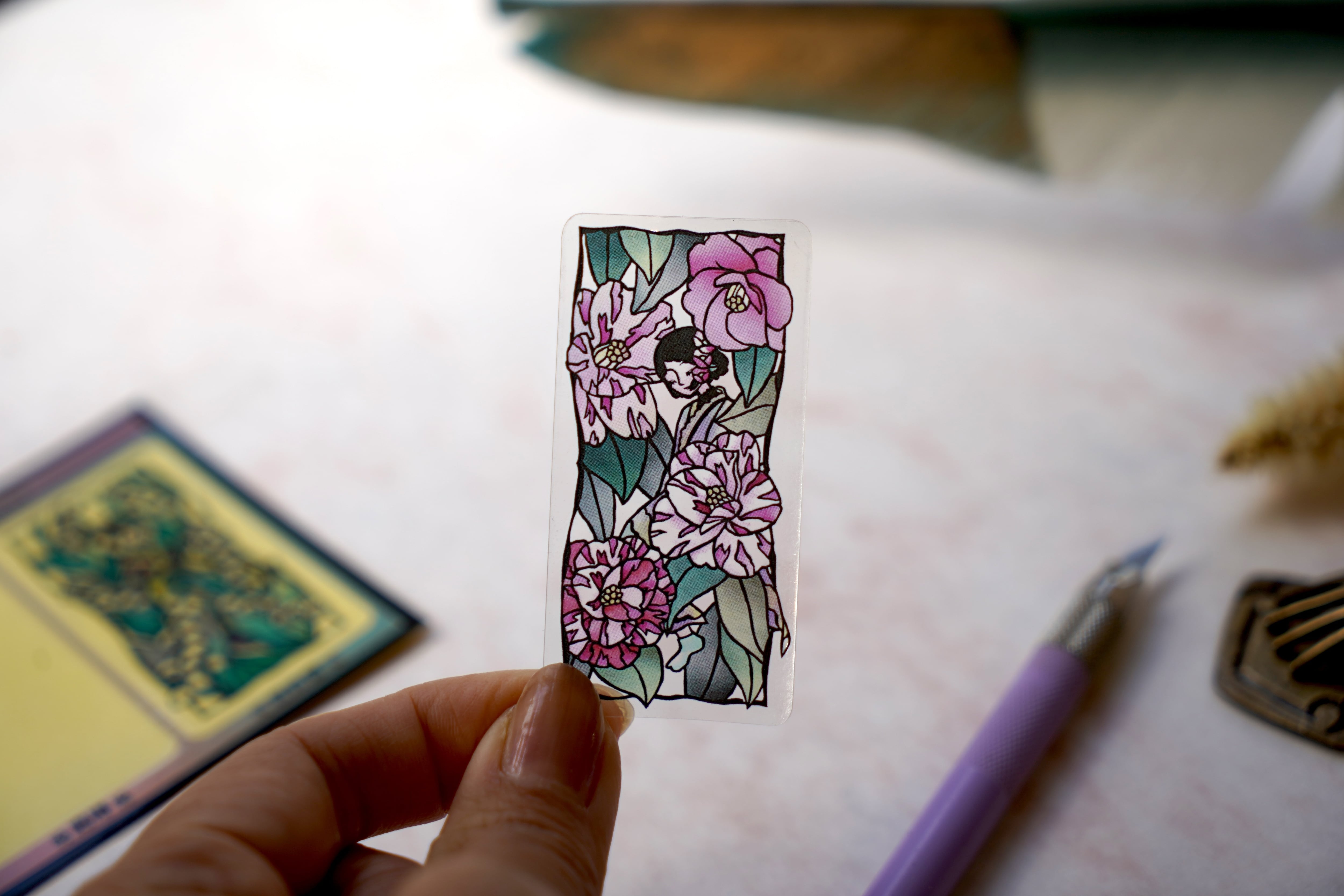 着物の女の子たちの華やかなデザインは、白い紙に貼るとその美しい色合いが際立ち、発色の良さを実感できます。透明シールであるため、ガラスやアクリルなどにも貼ると綺麗です。